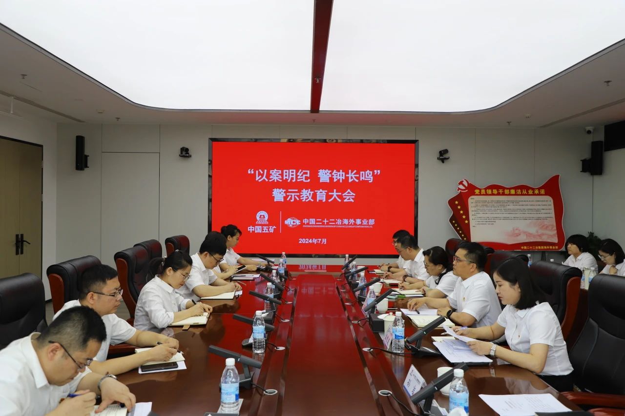 會上,海外事業部紀檢科科長楊丹傳達中國五礦典型案例;與會人員集中觀看了警示教育片《持續發力 縱深推進》之《強化正風肅紀》;黨委書記、紀委書記、代理工會主席、副總經理孟秀蓮對黨員干部進行集體廉潔談話;與會人員進行了“清廉承諾我擔當”集體簽名;事業部主要領導發放《海外事業部警示教育讀本》。
